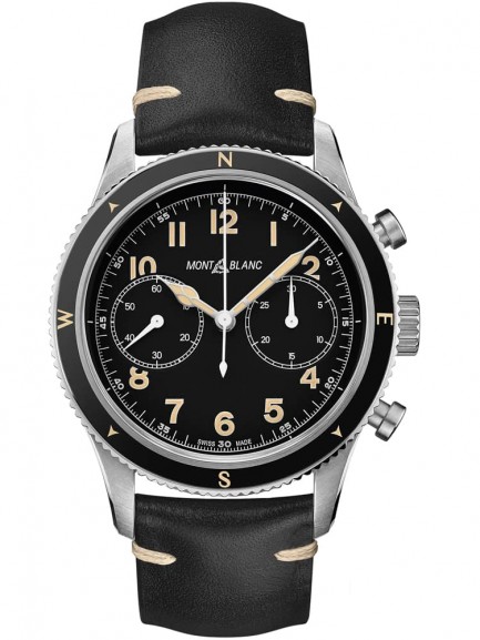 The Montblanc 1858 watch series is inspired by the professional Minerva watches from the 1920s and 1930s which were conceived for military use and exploration. This edition is limited to just 1858 pieces worldwide and combines a 42mm round shaped stainless steel case and black leather strap with a traditional buckle. It has a black analogue dial with chronograph sub-dials, luminescent hands and Arabic numerals, all of which is protected beneath domed scratch resistant sapphire crystal glass with an anti-reflective coating. Power is generated by the Calibre MB 25.13 automatic movement with 27 jewels and a power reserve of up to 48 hours. This model also has a water resistance of up to 100 metres.